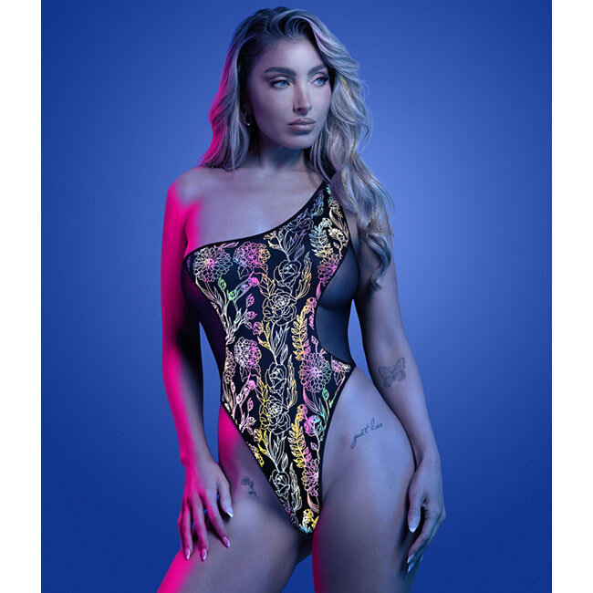 Flash reflective floral print one-shoulder teddy. 95% Nylon, 5% Spandex. Available in plus size.