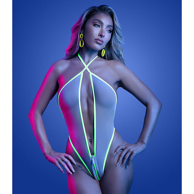 Glow-in-the-dark plunge zipper teddy with halter ties. 95% Nylon, 5% Spandex