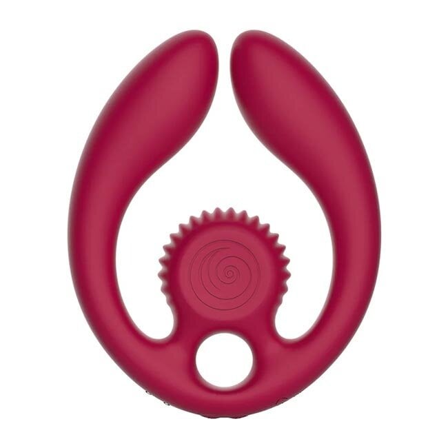 We are frequently asked if we can recommend a vibrating double dildo that is shaped for couples play. The Gizi Duo by SVibe (aka Snail Vibe) is a great option, with plenty of creative uses to choose from. You can add penetration/vibration to classic "scissoring," or to other positions that allow for simultaneous penetration between two partners with vulvas. The Gizi Duo can also be used for pegging, and is even great for solo play (one of the arms can be used as a handle).