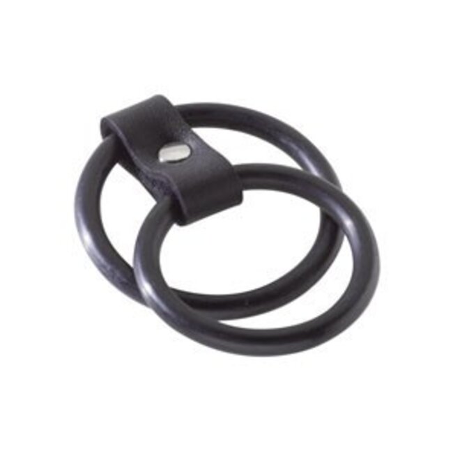 This dual cock ring includes a 2" base ring and a 1.5" shaft ring, held together with a leather strap. Product number BSPL-06D2.